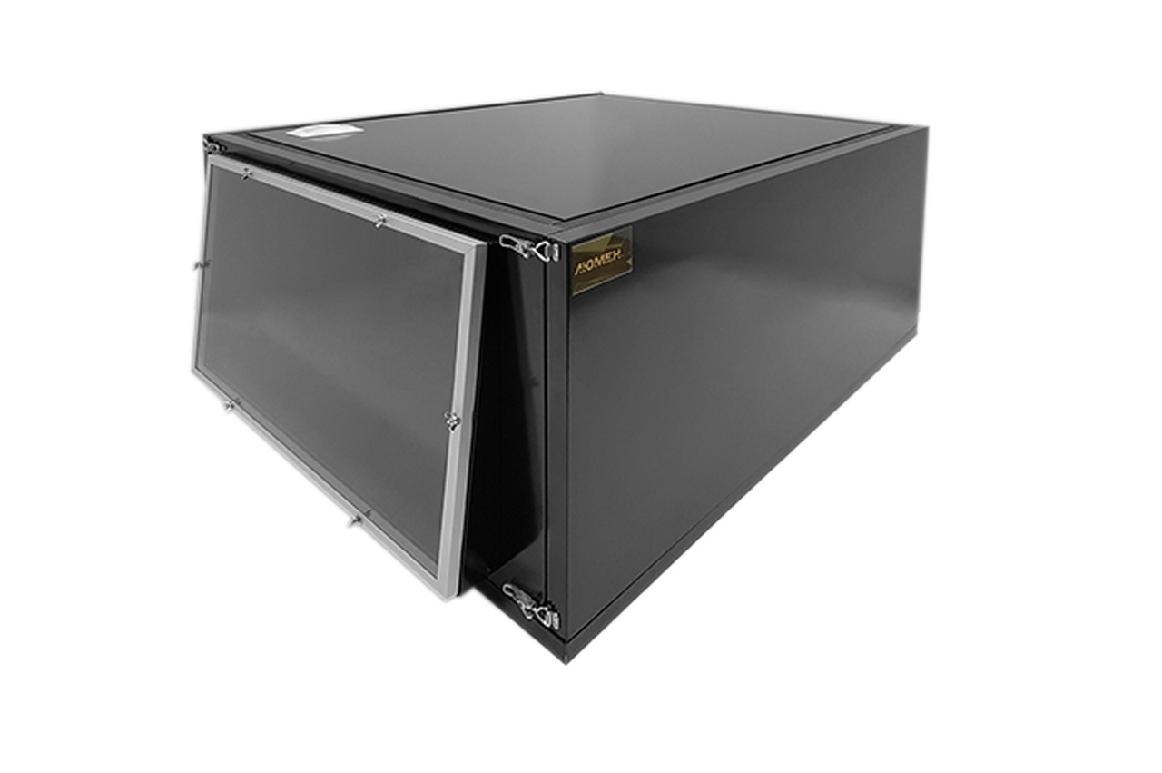 Корпус кинобокса выполнен из композитного алюминия и изнутри облицован негорючим звукоизоляционным материалом. Конструкция спроектирована таким образом, чтобы обеспечить легкий доступ для сервисных специалистов – с двух сторон бокса есть съемные дверцы на магнитах или газ-лифтах, предусмотрена поворотная платформа для обслуживания кинопроектора, опционально бокс оснащается лифтовым подъемником для повышения удобства обслуживания кинопроекционного оборудования.